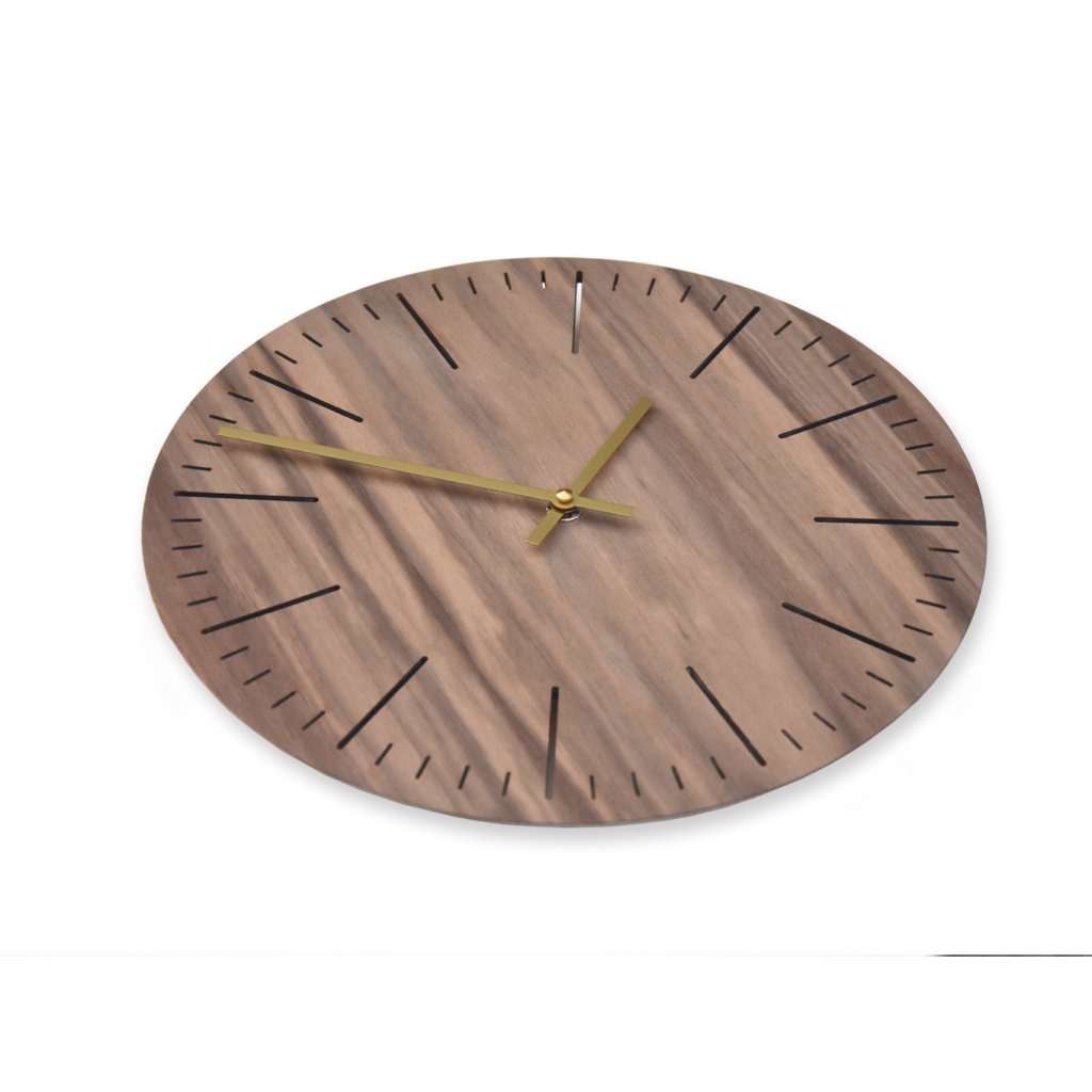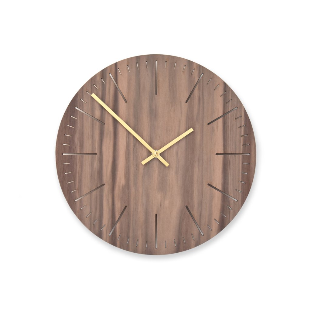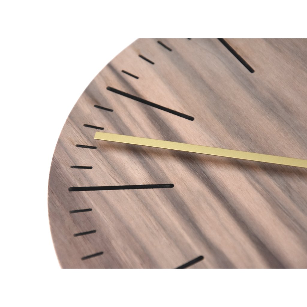 Minimalistické dřevěné hodiny kolekce LINE z přírodní ořechové dýhy s prořezaným ciferníkem.