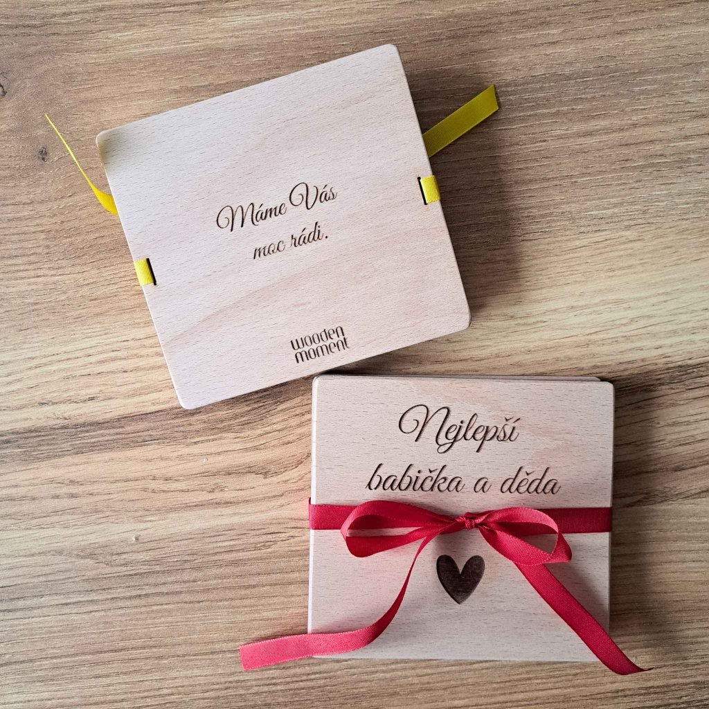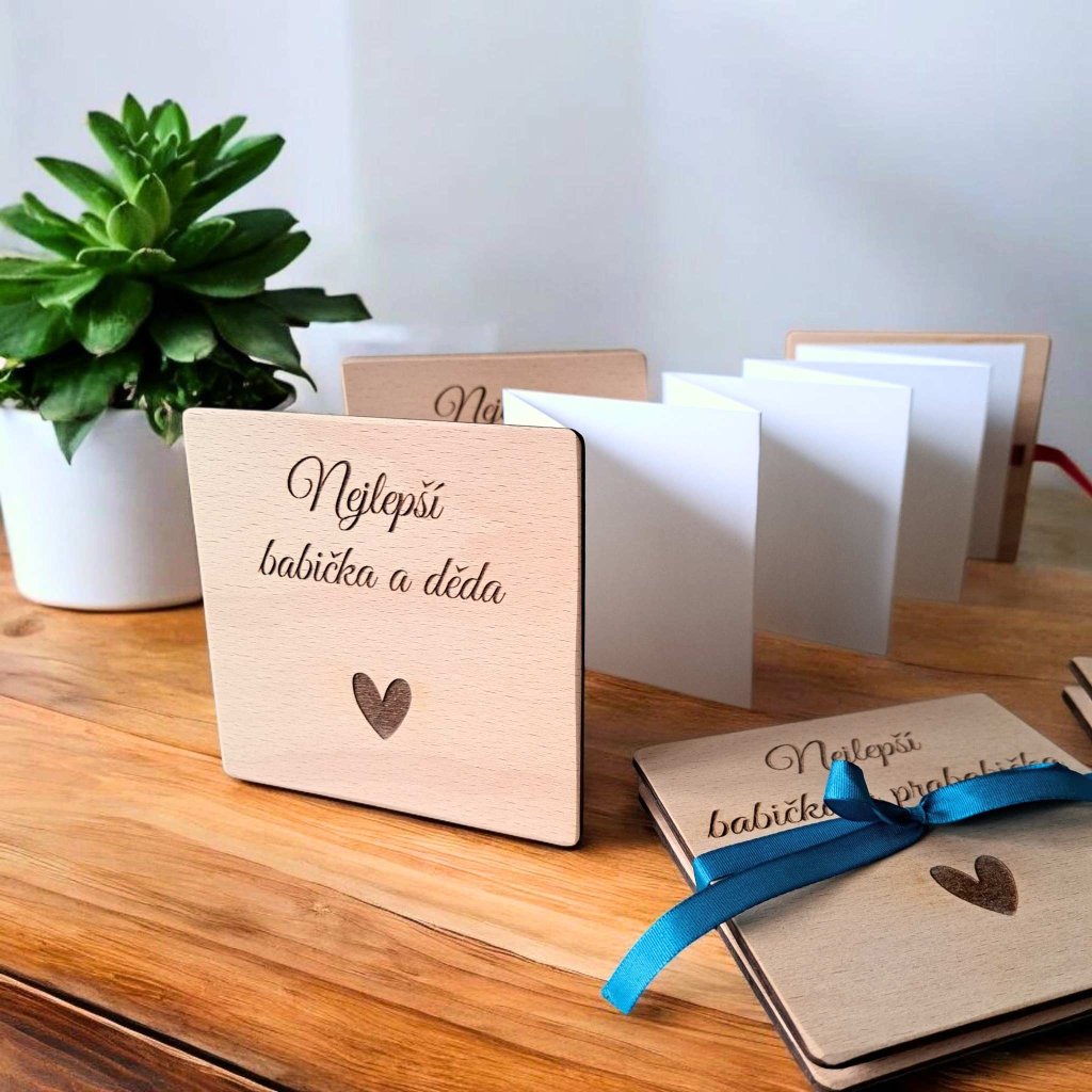 - Dřevěné desky z kvalitní překližky s gravírovaným nápisem „Nejlepší babička a dědeček“ a jemným srdíčkem.