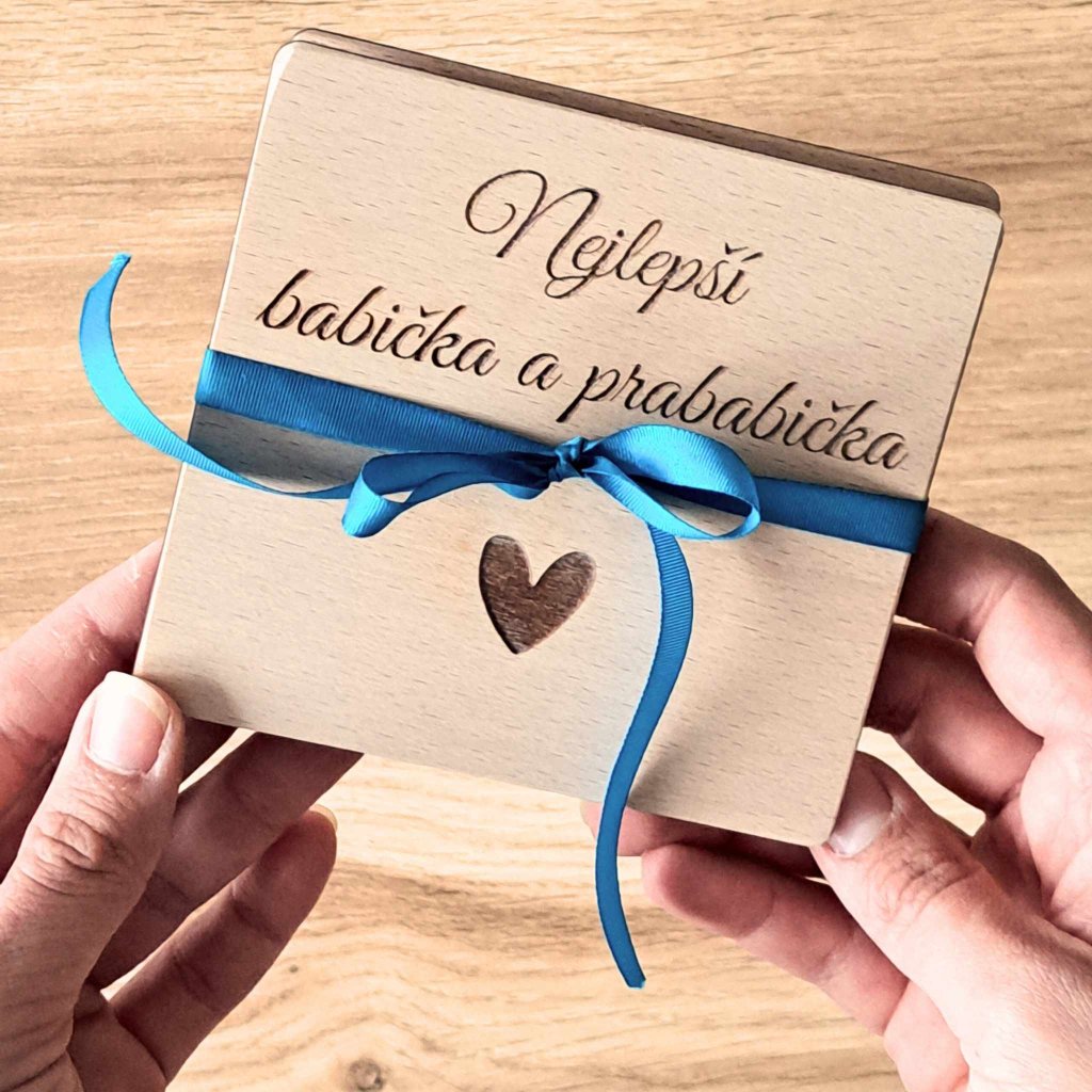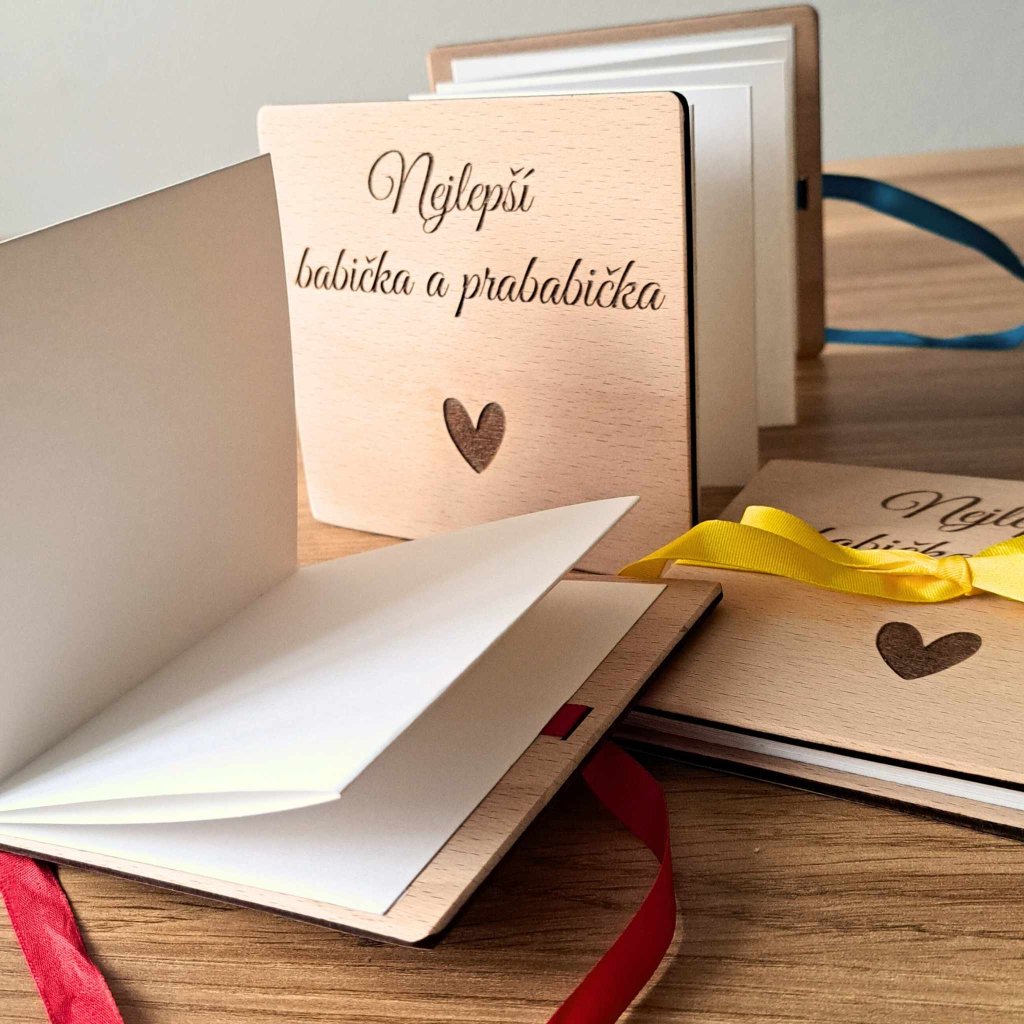 Motiv s gravírovaným nápisem „Nejlepší babička a prababička“ doplněný jemným srdíčkem a prázdnými listy uvnitř k dotvoření. Lze na přání změnit.