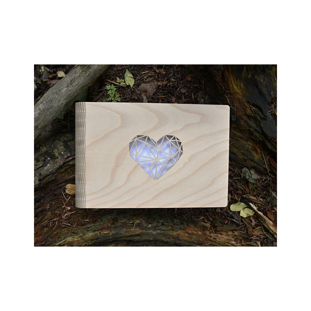 Dřevěné svatební fotoalbum s unikátní vazbou, která vás bezpochyby překvapí. Ať už bude sloužit jako fotoalbum na svatební fotografie, nebo jako svatební kniha hostů, jistě bude nezapomenutelné. Na přední straně album zdobí geometrické linie ve tvaru srdce.
